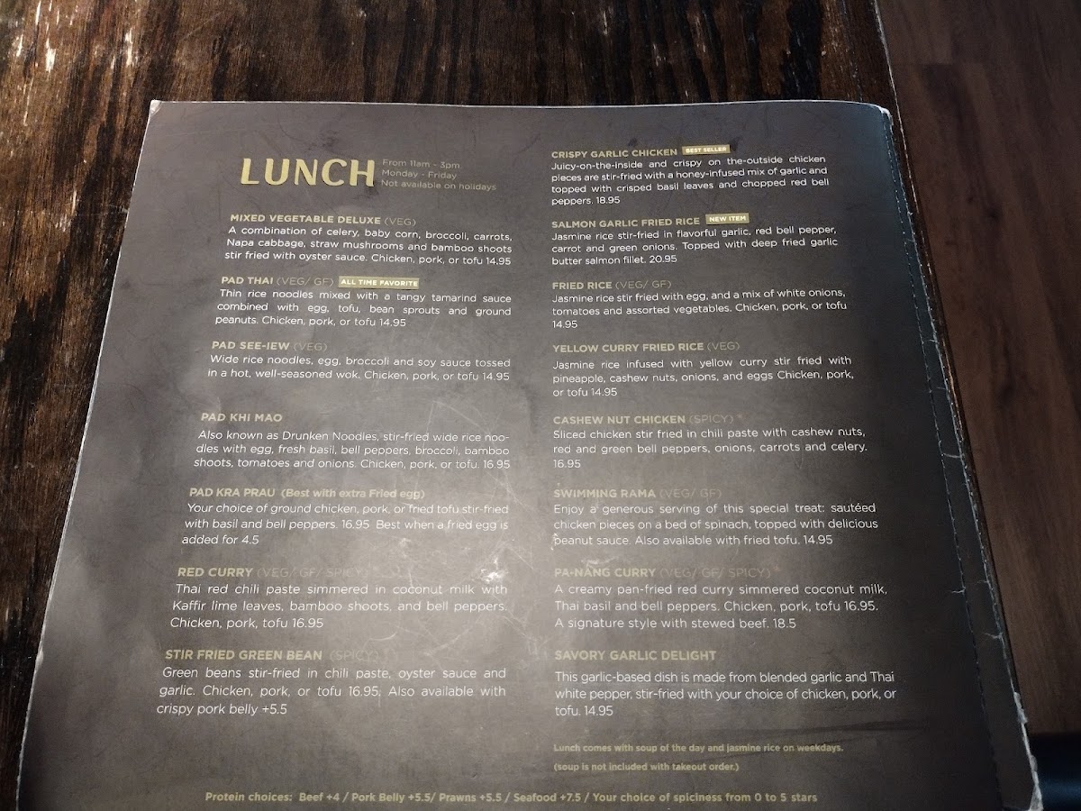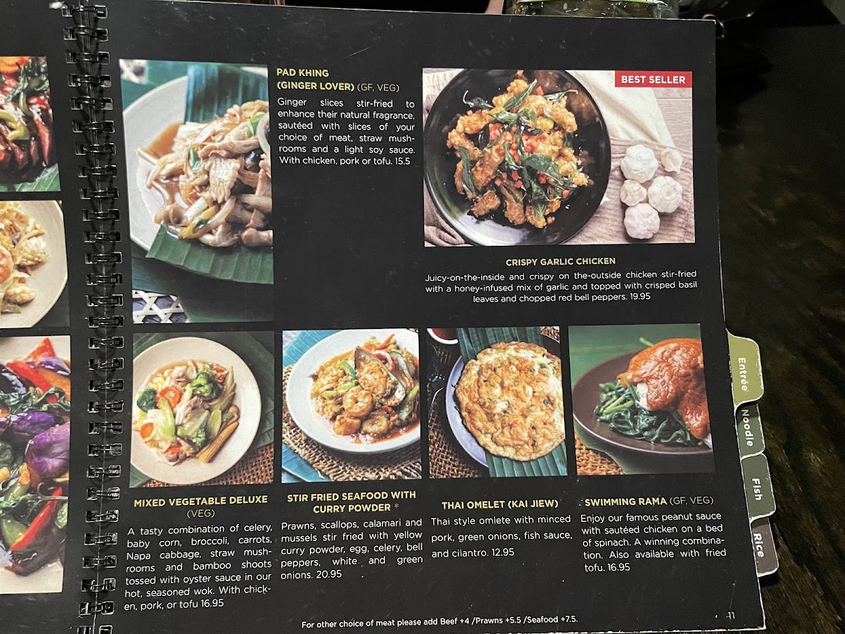 Rice and Noodle Dishes: There are several rice-based offerings, including chili fried rice with a choice of chicken, pork, or tofu, crab fried rice, and yellow curry fried rice. Noodle options feature both fried and stir-fried varieties typically found in Thai cuisine.