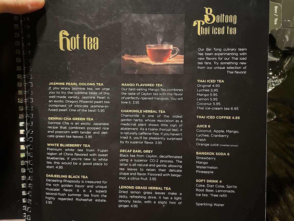 The menu at Bai Tong Thai Restaurant in Redmond offers a variety of authentic Thai dishes that cater to diverse dietary preferences, including gluten-free and vegetarian options. The menu is organized into several categories, featuring appetizers, main courses, rice and noodle dishes, and desserts.