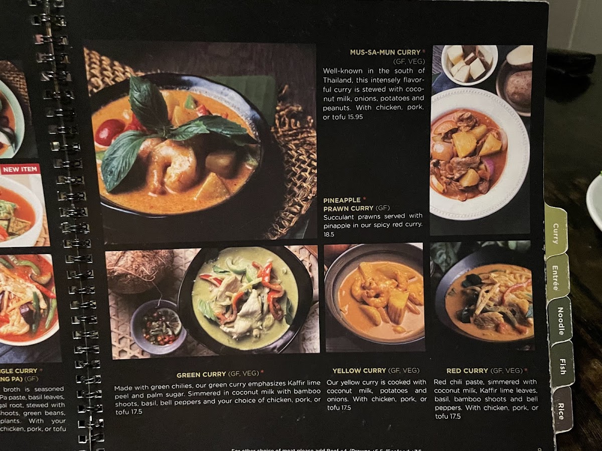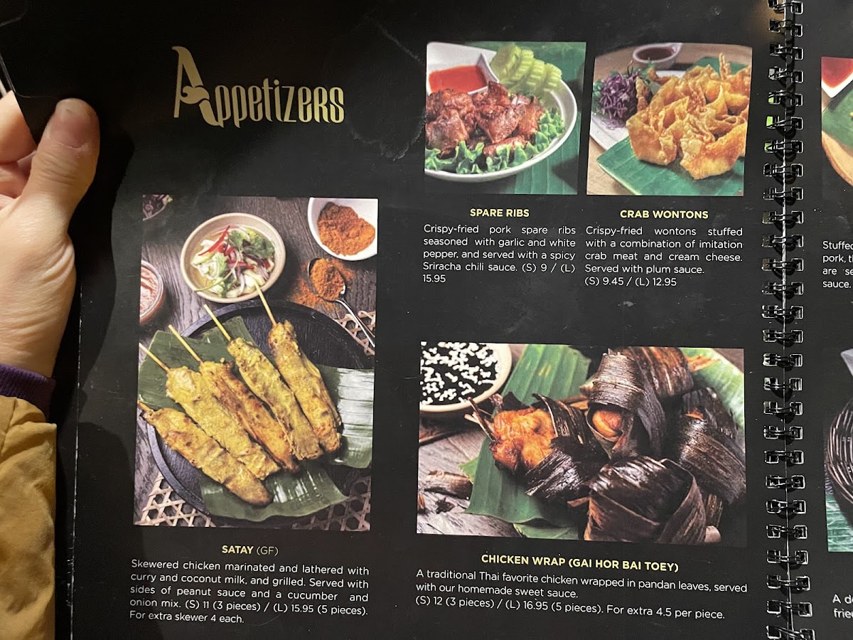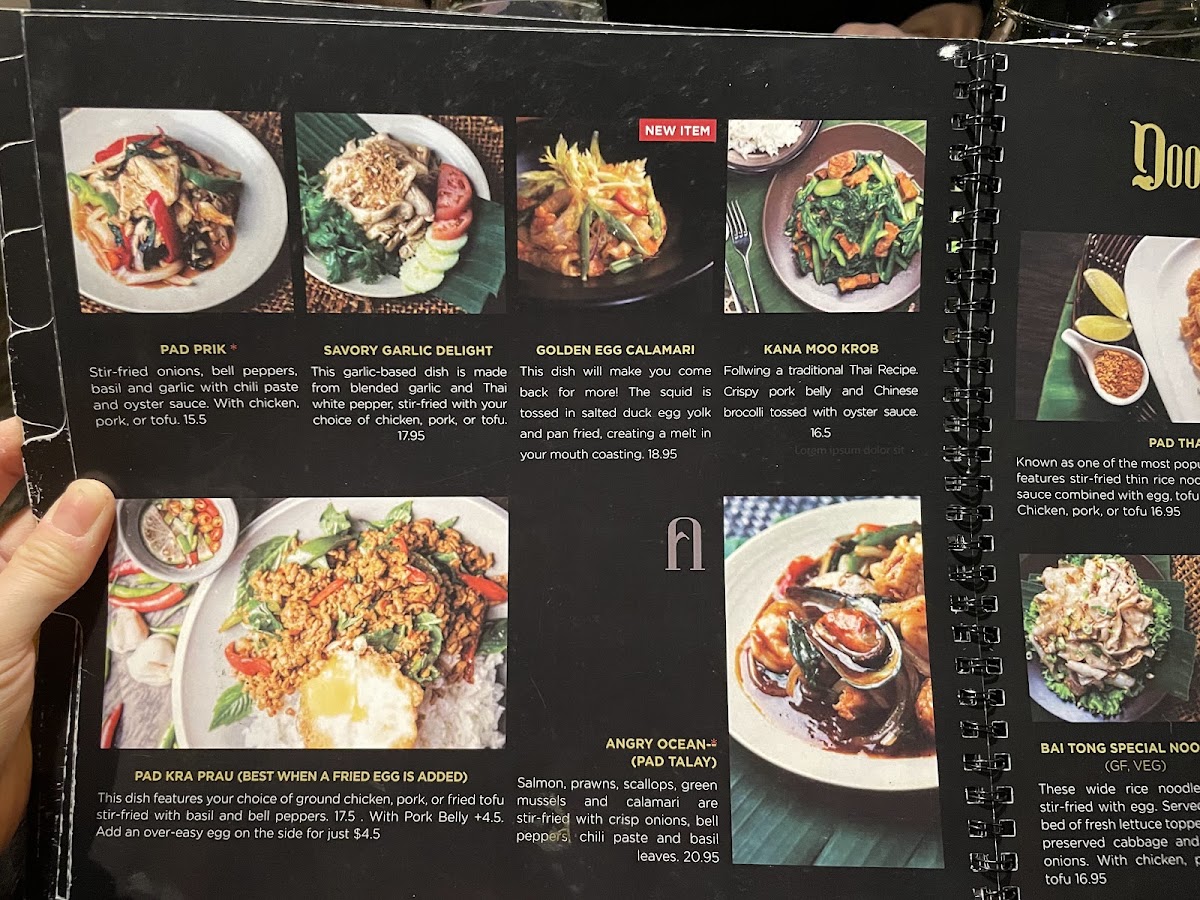 Desserts: The dessert selection offers traditional Thai sweets such as mango sticky rice (seasonal), black sticky rice pudding, and a variety of ice cream flavors including coconut, mango, lychee, Thai tea, and pandan. Additional dessert choices include fried ice cream and molten lava cake.